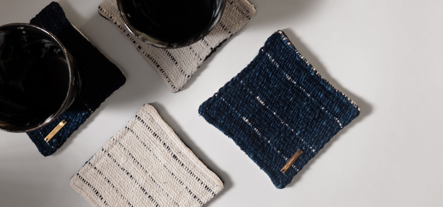 Crafted from organic white cotton interwoven with indigo blue yarn in a pinstripe pattern, resulting in a clean, minimalist appearance with a touch of uniqueness.